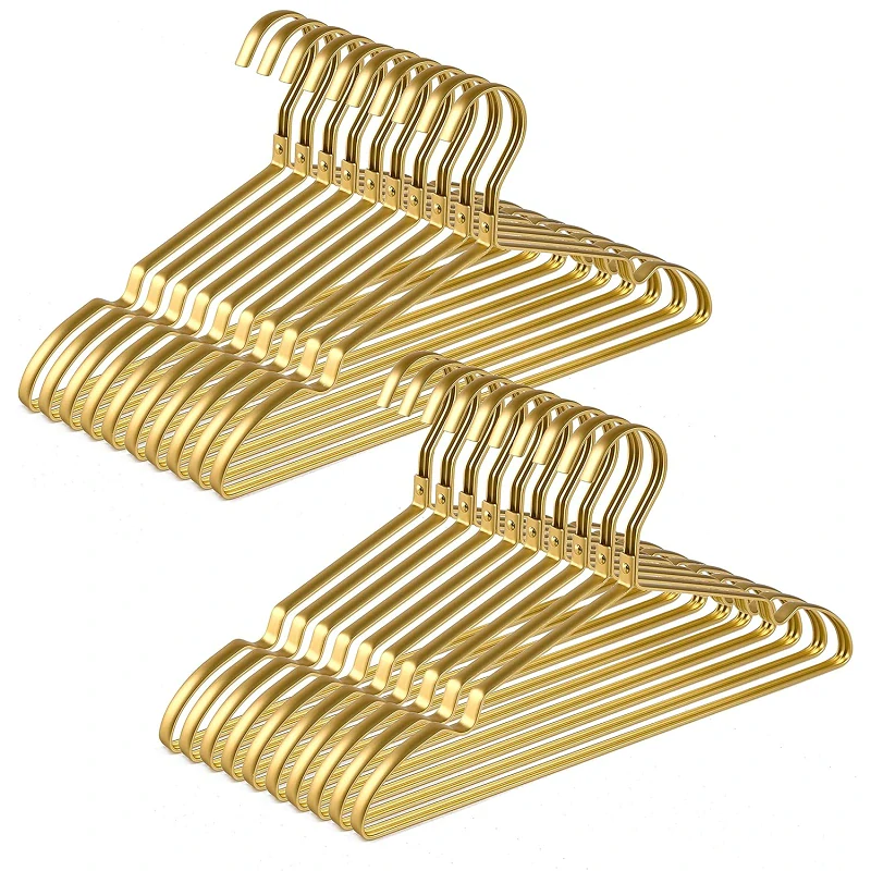 Kvalitní lusuxní šatní designové ocelové ramínko zlatého provedení i vzhledu vhodné pro luxusnější butiky, prodejny i dražší kousky oblečení.
