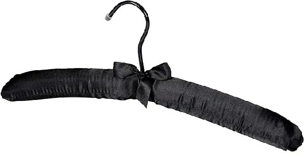 Kvalitní luxusní černé polstrované saténové ramínko pro vzácnější kousky oblečení. Tato ramínka jsou také hojně oblíbená díky samotnému vzhledu a polstrování při prezentaci ve svatebních salónech, prodejnách svatebních šatů, luxusnějších buticích a obchodech.
